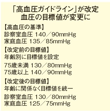 今年、「高血圧ガイドライン」が6年ぶりに改定。これまで年齢別に設定されていた目標値(75歳未満は130/80㍉Hg、75歳以上は140/90㍉Hg)が、 年齢に関係なく診察室血圧を130/80㍉Hg未満、家庭血圧を125/75㍉Hg未満に統一。 高齢者の場合、転倒リスクなどを考慮して「血圧を下げ過ぎない方が良い」という考えもありましたが、近年の研究で〝血圧が低い方がリスクが少ない”ことが報告され、このような改定に至りました。
